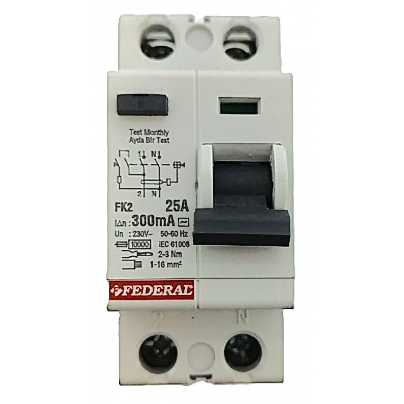 Federal FK2E 2x25A 300mA 10kA Kaçak Akım Rölesi: Temel Özellikler Üretici Firma: Federal Ürün Modeli: FK2E Kutup Sayısı: 2 (2x) Monofaze (tek fazlı) elektrik sistemleri için tasarlanmıştır. Faz (L) ve Nötr (N) hatlarını korur. Anma Akımı: 25A Rölenin sürekli olarak üzerinden güvenle geçirebileceği maksimum akım miktarıdır. Hassasiyet (Nominal Kaçak Akım): 300mA Bu hassasiyet seviyesi, genellikle yangın koruması için tercih edilir. 300mA veya daha büyük bir kaçak akım tespit ettiğinde devreyi keserek yangın riskini azaltır. Kesme Kapasitesi (Kısa Devre Akımı): 10kA Kısa devre anında güvenli bir şekilde kesebileceği maksimum akım değeridir. Bu yüksek kesme kapasitesi, cihazın daha zorlu koşullarda bile güvenli çalışmasını sağlar. Çalışma Gerilimi: 230V AC Montaj: Standart DIN Rayı montajına uygundur.